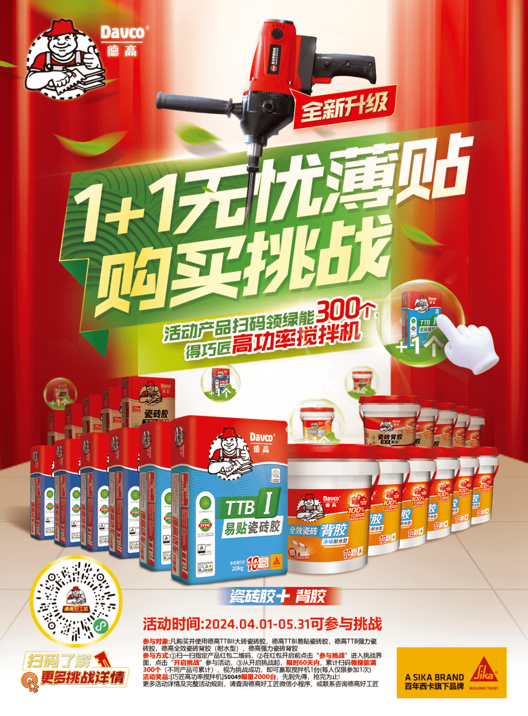 要贴砖牢固,推荐使用德高无忧薄贴贴砖体系!活动期间购买德高指定瓷砖胶+指定背胶,还可参与购买挑战,不仅包包大三元,桶桶送滚筒,还有机会赢取巧匠高功率搅拌机!隐藏福利远不止这些,快来参与!