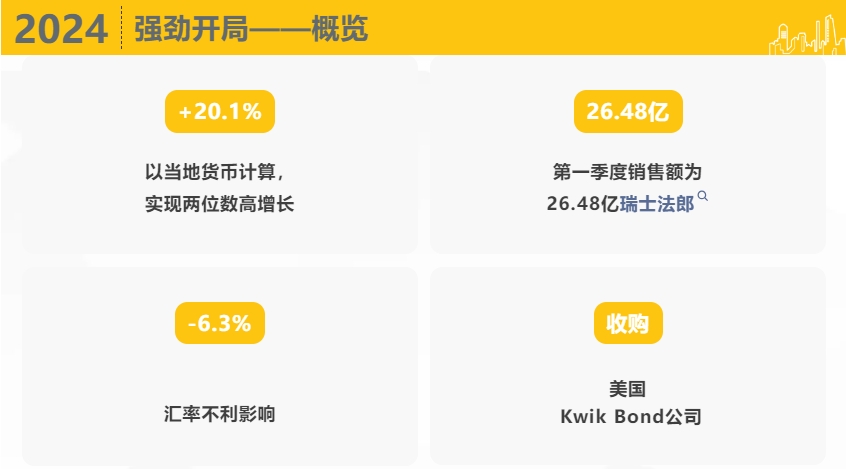 西卡回顾了当前财年的成功开局, 2024 年第一季度的销售额,以当地货币计算,增长了 20.1%。19.9%的高收购效应促成了第一季度创纪录的销售额,这主要得益于西卡迈伯仕的收购,该收购在2023年5月完成合并。西卡在整体市场萎缩的情况下,再次成功实现有机增长。瑞郎的强势表现对货币产生了-6.3%的负面影响。因此,2024年第一季度,西卡的销售额为26.48亿瑞士法郎,相当于销售额增长了13.8%(以瑞士法郎计价)。