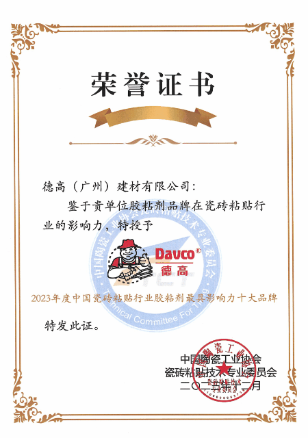 西卡德高喜获TCT权威颁发2023年度中国瓷砖粘贴行业胶粘剂最具影响力十大品牌、中国瓷砖粘贴行业最具推动力企业。