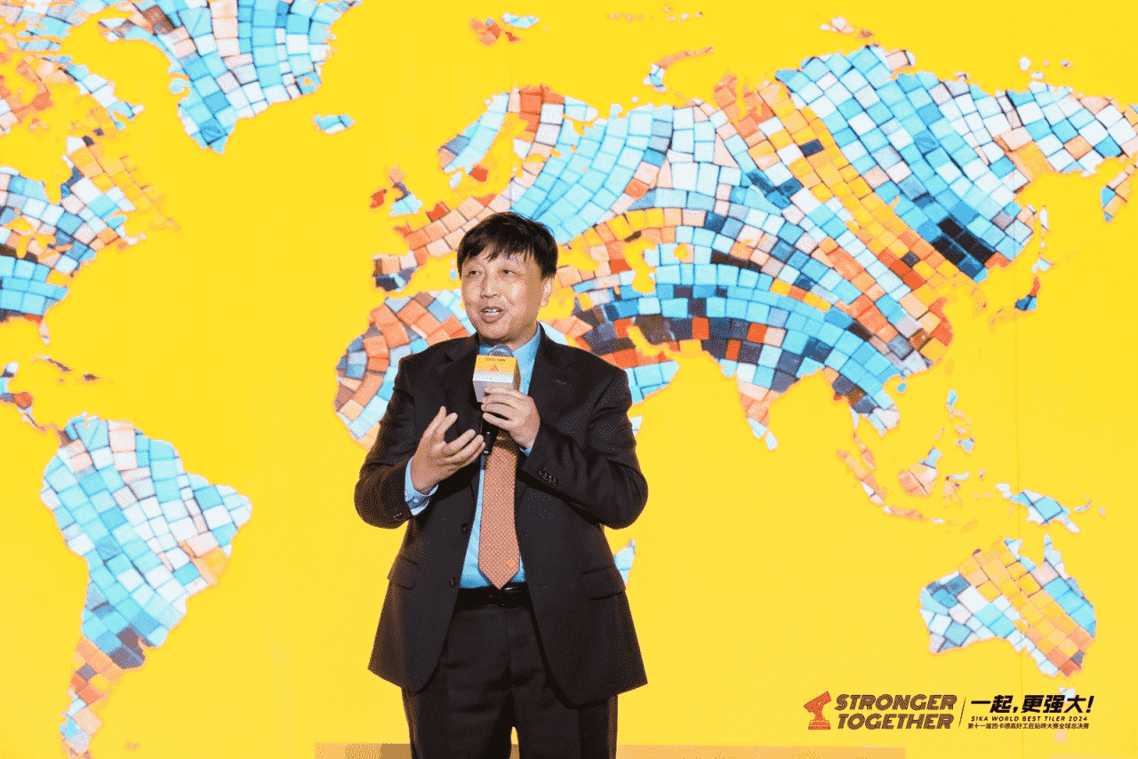 图注:西卡建筑装修材料·中国总裁徐英先生在活动致辞里,诚挚感谢集团领导及社会各界,对好工匠贴砖大赛的高度关注与支持