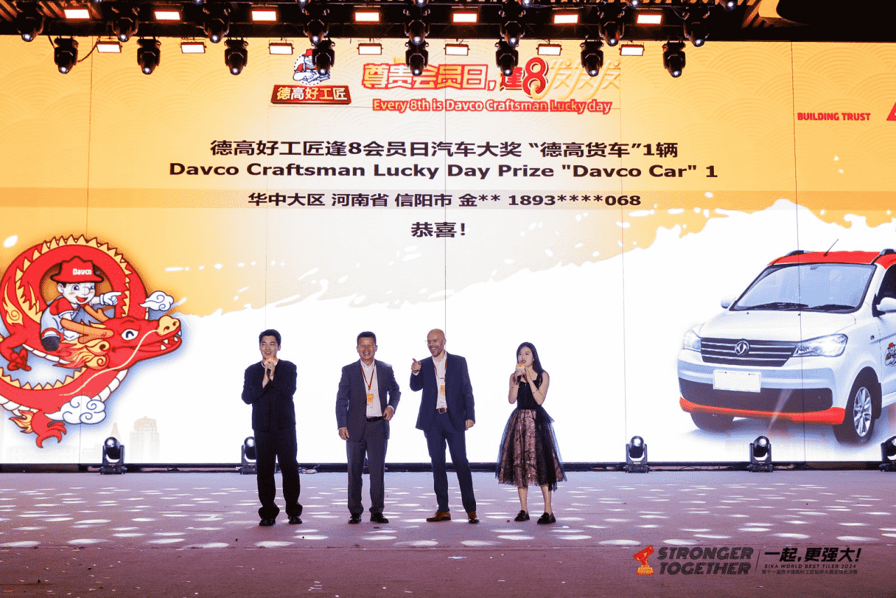 图注:魔都之夜精彩纷呈:西卡德高副总经理张泳东先生与西卡亚太地区建筑装修业务发展负责人Bruno Alves先生现场抽取幸运好工匠,喜获德高货车一辆