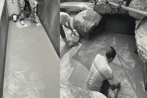 当然能搞定!事实上,已经有不少师傅使用德高防水地宝,进行水池、鱼池基面的找平及防水施工。